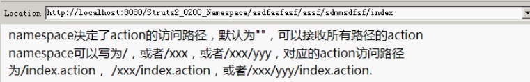 namespace决定了action的访问路径,默认为"",表示可以接收所有路径的action。namespace也可以写为/,或者/xxx,或者/xxx/yyy,对应的action访问路径为/index.action,/xxx/index.action,或者/xxx/yyy/index.action。