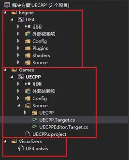 - 我们的代码需要在此工程中编写。虚幻中采用了编译模块方式进行引擎构建,所以对于引擎来说,我们编写的内容只是一个模块,模块会被动态编译为库文件,加载到引擎中使用