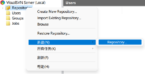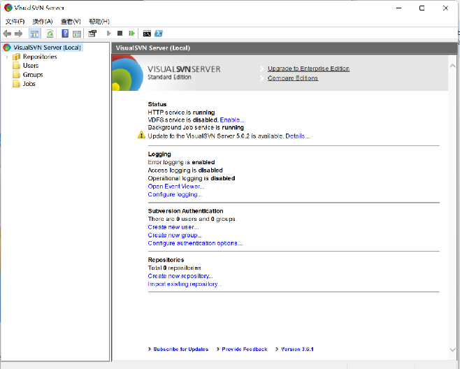 4. 创建版本库:启动VisualSVN Server Manager,可以在窗口的右边看到版本库的一些信息(状态,日志,用户认证,版本库之类的)