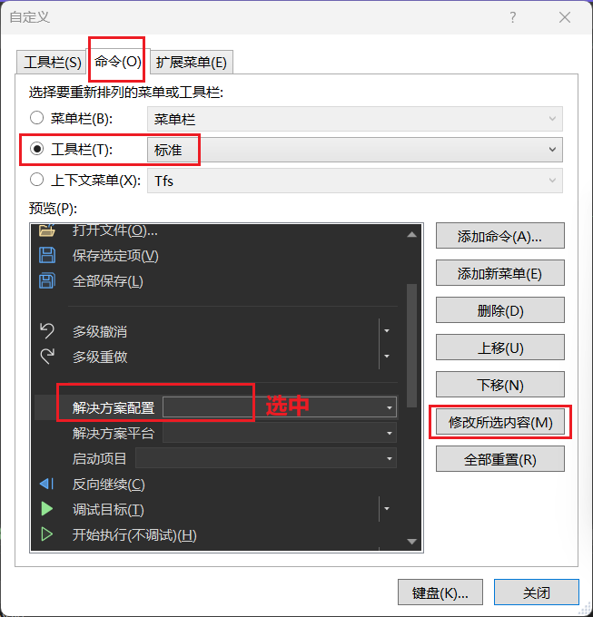 - 可以在工具栏任意处右键,自定义 - 命令:工具栏:标准(选择“解决方案配置”)- 修改所选内容