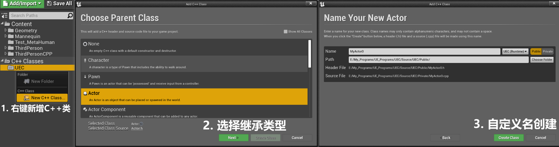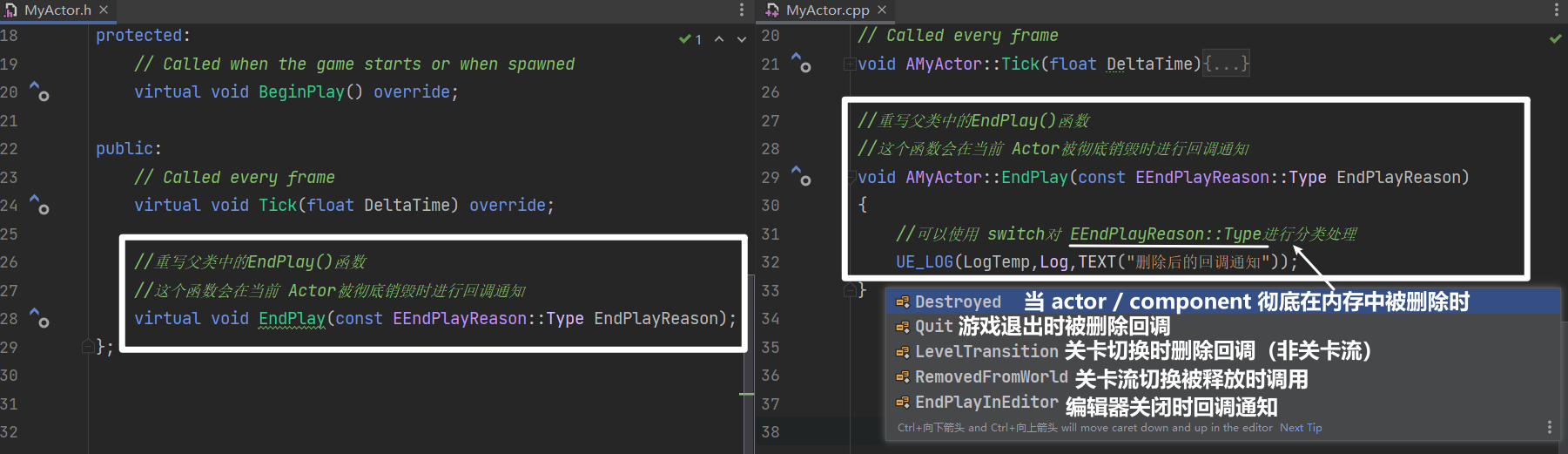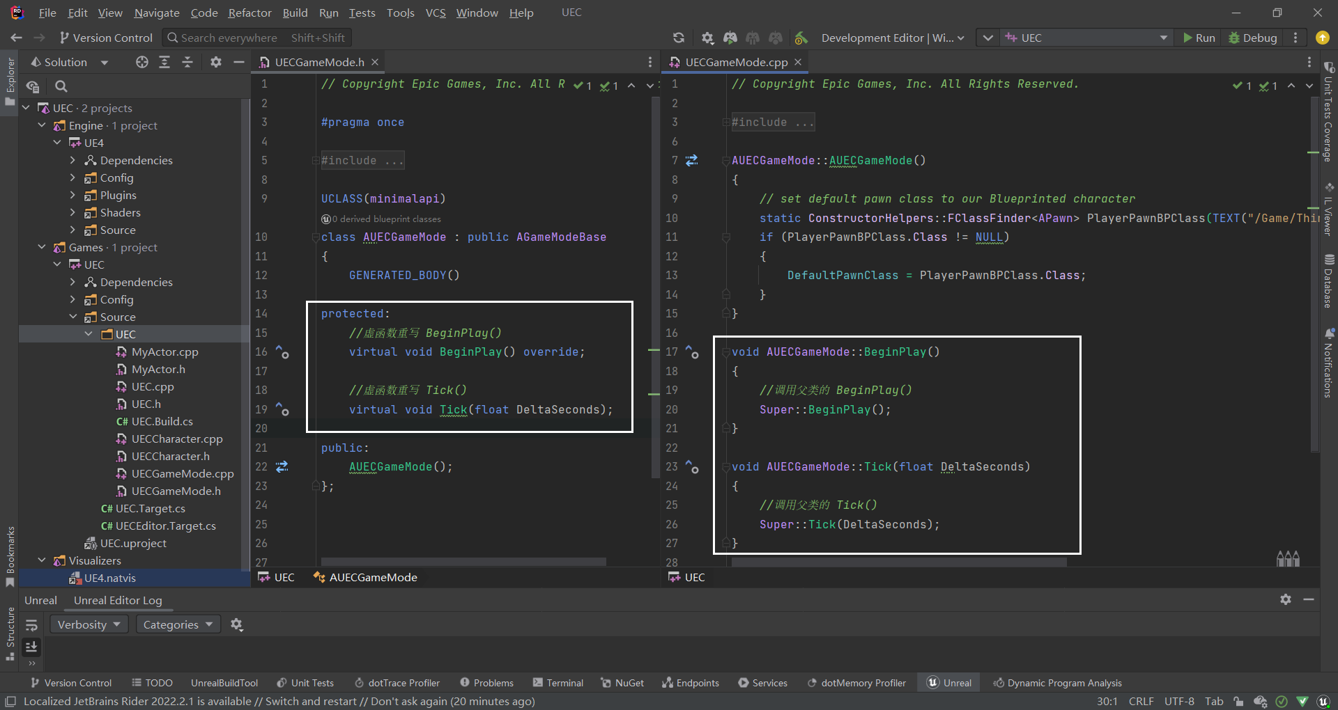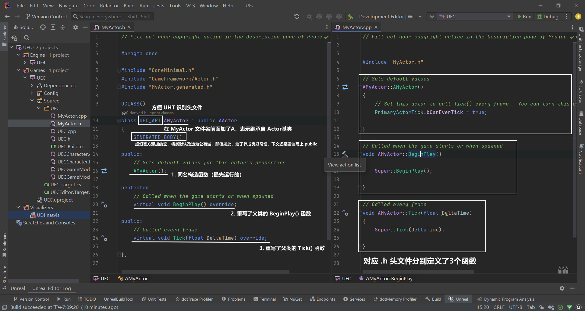 - 重写 BeginPlay() 函数和 Tick() 函数:头文件 .h 中写函数声明,.cpp 文件中写函数定义