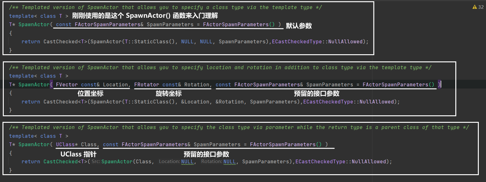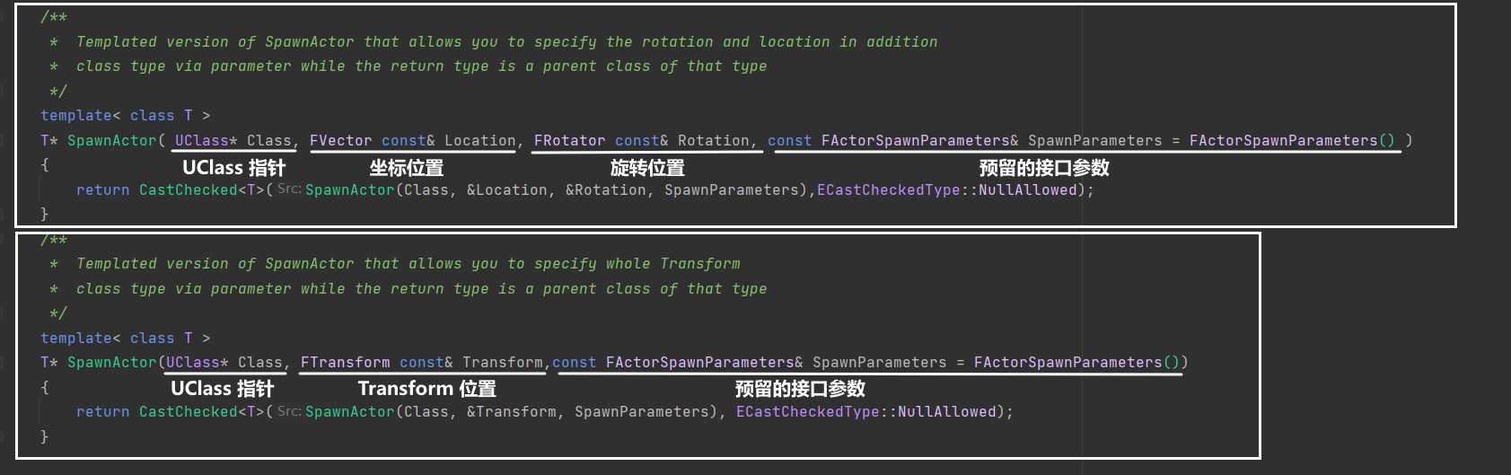 /** Templated version of SpawnActor that allows you to specify a class type via the template type */ //(泛型编程)由于 C++ 是编译型语言,在编译前必须确定好类型, //定义一个还不确定具体类型的 T类型,调用时需使用尖括号来确定<具体类型> template< class T > T* SpawnActor( const FActorSpawnParameters& SpawnParameters = FActorSpawnParameters() ) { return CastChecked<T>(SpawnActor(T::StaticClass(), NULL, NULL, SpawnParameters),ECastCheckedType::NullAllowed); }//此处插播一下【模板函数 / 泛型函数】的原理 //以 Sum 求和的重载函数为例: int Sum(int a, int b) { return a + b; } int Sum(float a, float b) { return a + b; } int Sum(double a, double b) { return a + b; } //调用 Sum 求和函数时,会根据传入参数的数据类型不同,调用如上不同的重载函数 //而当,不确定传入参数的数据类型时,C++提供了 “泛型编程” 的概念,申请任意一个符号类型(如 T)来代替未来将要传入的参数数据类型(效果如上) template<class T> //特殊情况下,有多个未知类型,则: template<class T,class T1,class T2> T SumFun(T a, T b) { return a + b; } //调用模板函数 / 泛型函数时,需要使用尖括号写出明确的类型 SumFun<int>(1,2); SumFun<float>(1,2); //参数1,2会被强转为 float 类型