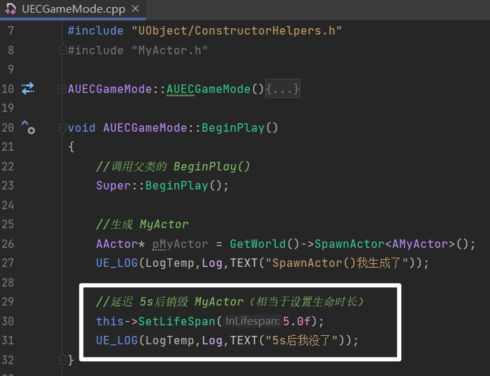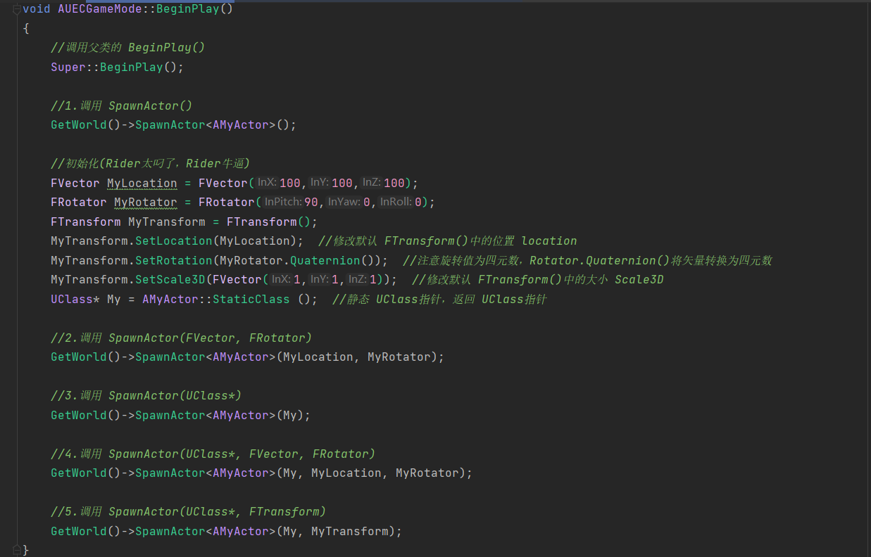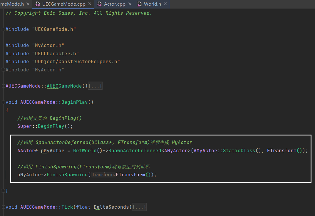- 在 BeginPlay() 函数定义中调用 SpawnActor() 函数