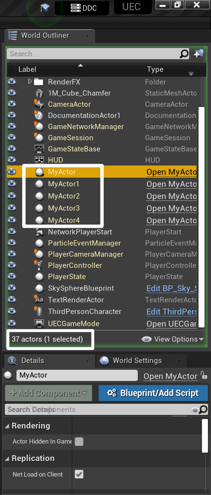 //2. 声明多播代理 Delegate_MultiNoP MultiNoP; Delegate_MultiTwoP MultiTwoP; //3.创建要绑定到无参无返的单播代理上的函数 void Func1_MultiNoP(); void Func2_MultiNoP(); void Func1_MultiTwoP(int32 A, int32 B); void Func2_MultiTwoP(int32 C, int32 D); virtual void BeginPlay();