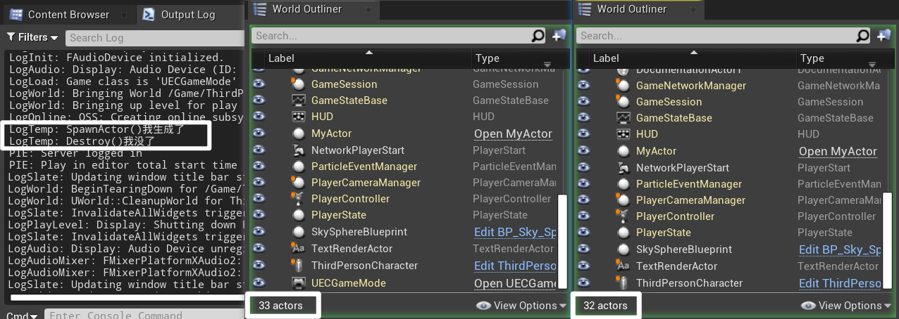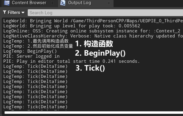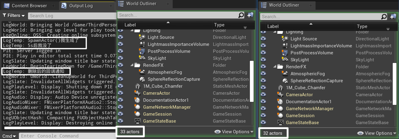 void AUECCharacter::BeginPlay() { Super::BeginPlay(); //4.将多个函数绑定到多播代理 MultiNoP.AddUObject(this, &AUECCharacter::Func1_MultiNoP); MultiNoP.AddUObject(this, &AUECCharacter::Func2_MultiNoP); MultiTwoP.AddUObject(this, &AUECCharacter::Func1_MultiTwoP); MultiTwoP.AddUObject(this, &AUECCharacter::Func2_MultiTwoP); //5.判断多播代理是否绑定 if (MultiNoP.IsBound()) { //6.调用多播代理,执行绑定的函数 MultiNoP.Broadcast(); } //5.判断多播代理是否绑定 if (MultiTwoP.IsBound()) { //6.调用多播代理,执行绑定的函数 MultiTwoP.Broadcast(2,3); }