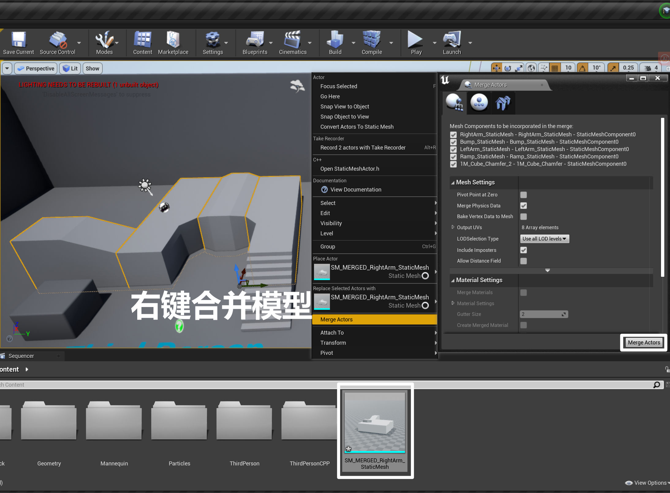 - 为降低 DrawCall 消耗,可以合并模型(将多个模型合并为一个,而非在一个蓝图中放置多个 Component),但会因此带来副作用: