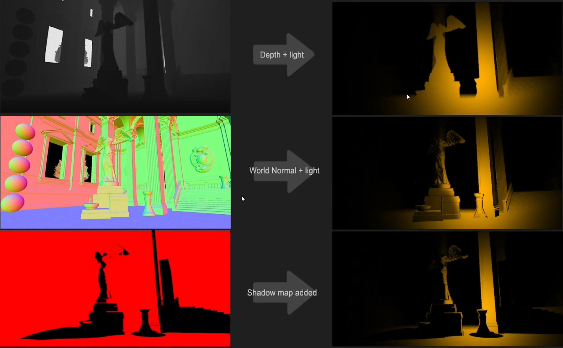 - 在渲染场景之前,先获取目标场景的深度图,进而获得每个需要渲染的物体会被遮挡的部分(不需要渲染的部分)