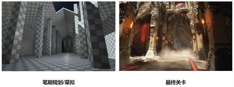 - 在使用静态网格体和其他成品美术资源填充关卡前,常用于规划关卡基本轮廓,以确定布局和流程
