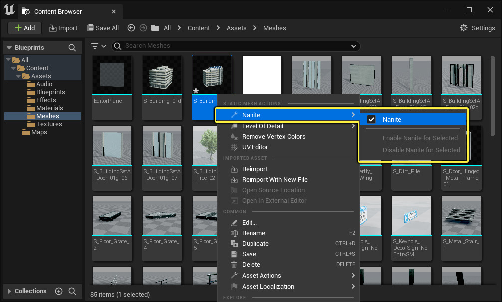 - 建议使用 Nanite Tool,将所有导入的 Static Mesh 都转换为 Nanite Mesh