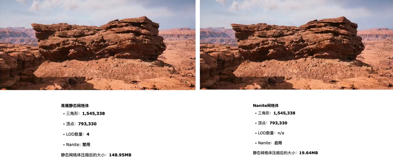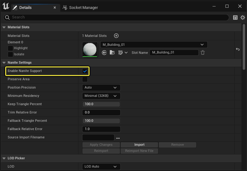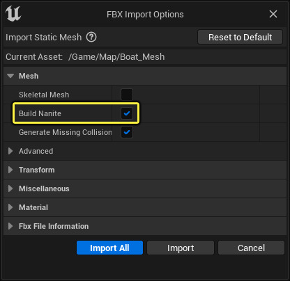 - 导入的高面数 Static Mesh 可以按需转换为 Nanite Mesh,以优化性能