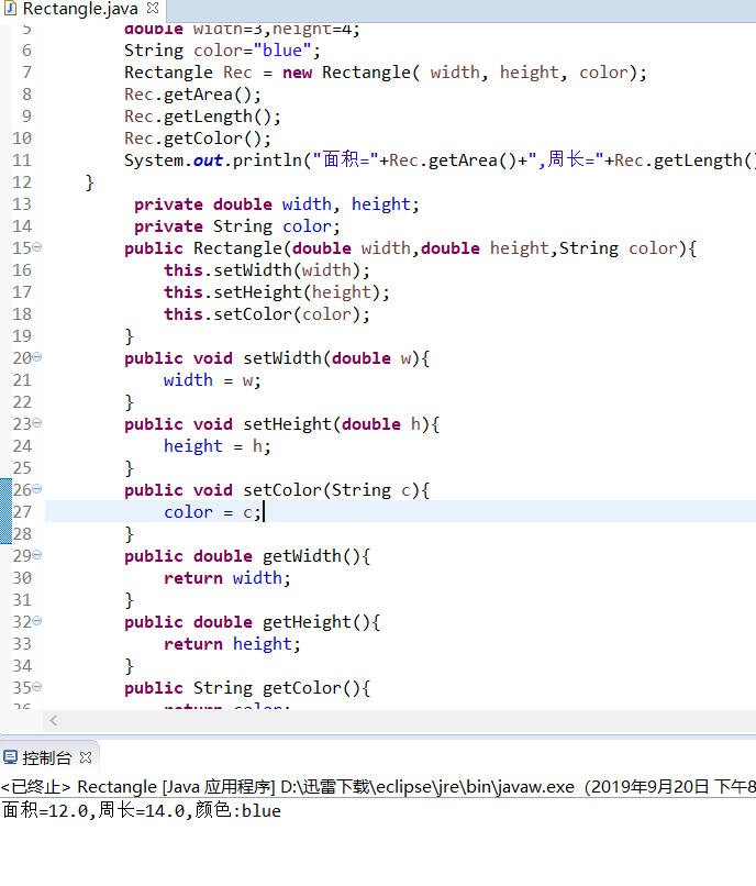 - 写一个名为Rectangle的类表示矩形。其属性包括宽width、高height和颜色color,width和height都是double型的,而color则是String类型的。