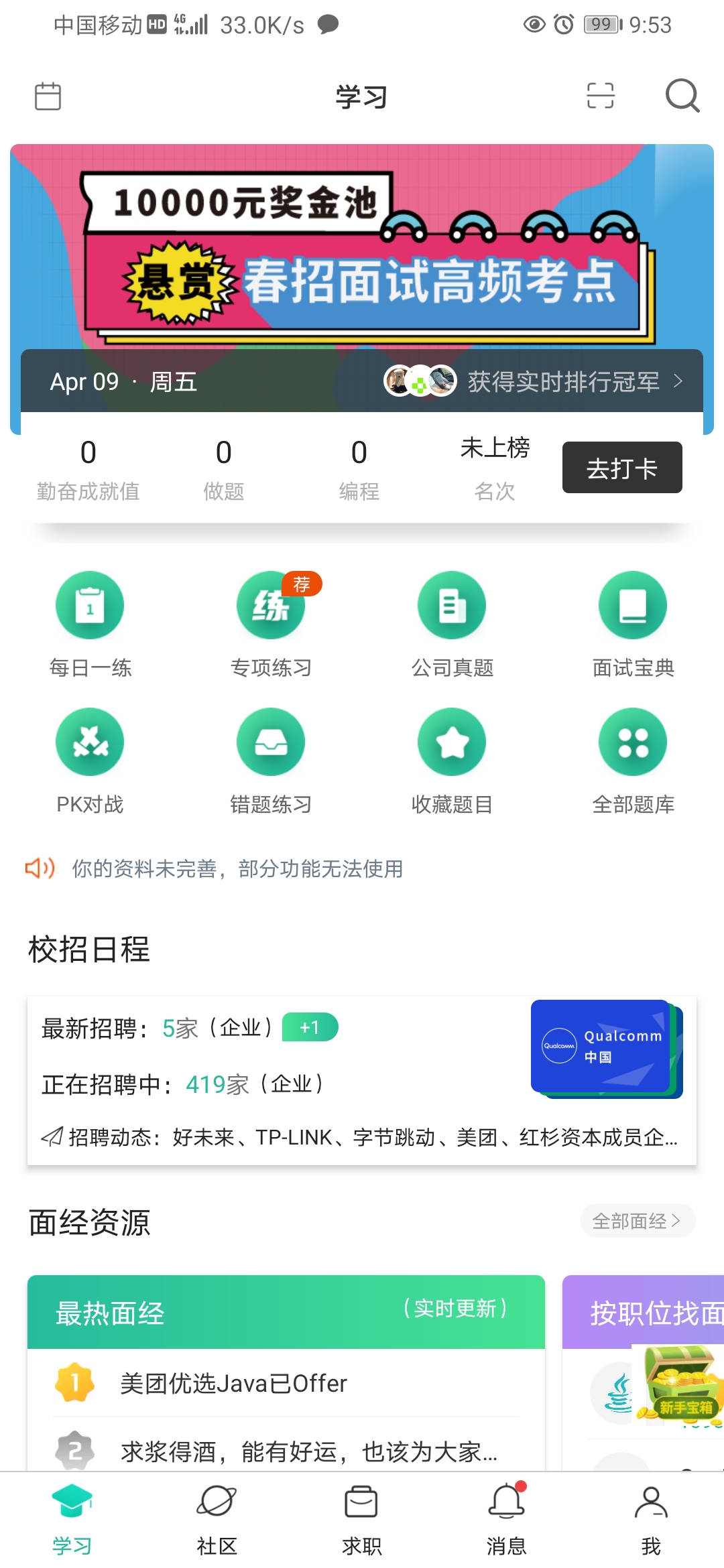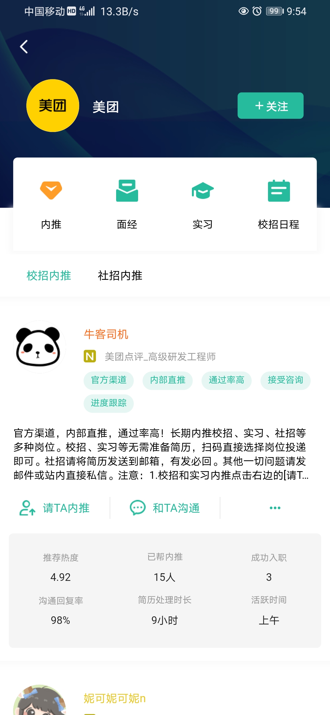 这两款软件因为非常类似,所以相比较差别不大,但是特别吸引我的还是牛客内推这个功能模块,他在学习之余还可以和名企之间沟通交流