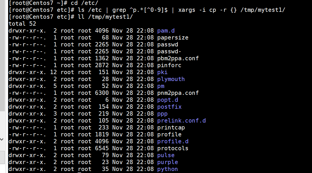 3、ls /etc/ | grep '^p.*[^0-9]$' | xargs -i cp -r {} /tmp/mytest1/