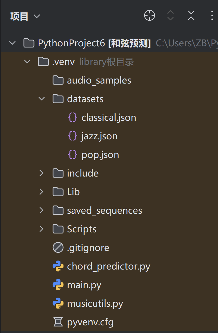 创建和弦预测项目,根据项目结构,在根目录下创建python代码及和弦保存目录文件