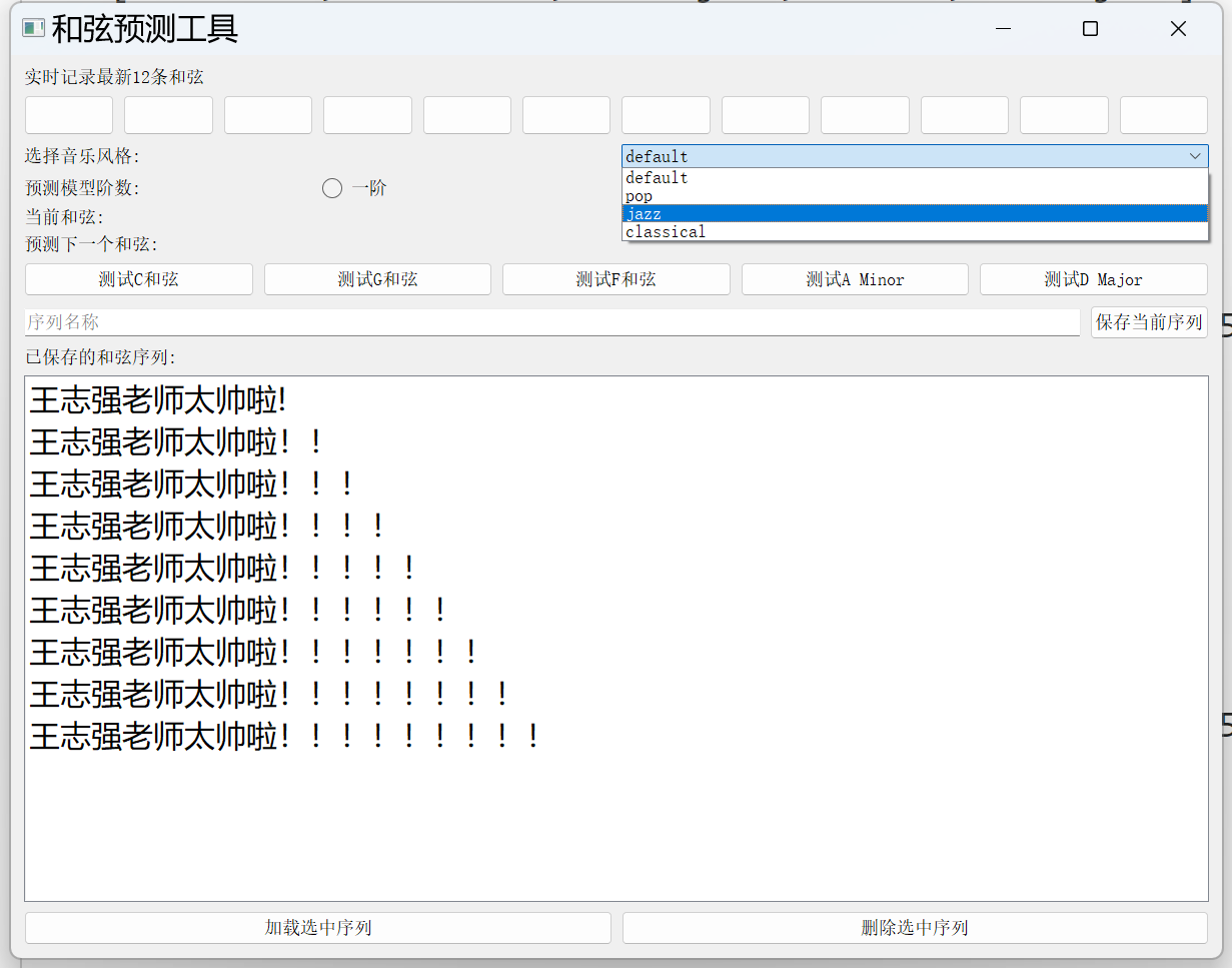风格切换:支持选择音乐风格(默认、流行、爵士等),影响预测模型和预测结果。