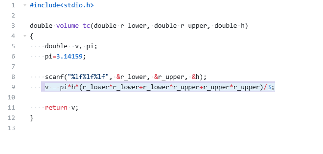 本题要求实现函数求圆台体积,定义并调用函数volume_tc(r_lower, r_upper, h)计算下底半径为r_lower、上底半径为r_upper、高度为h的圆台的体积,函数类型是double。