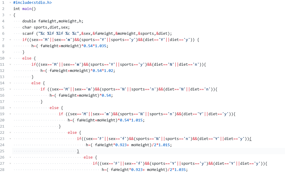 试编程从键盘输入用户的性别(用字符型变量sex存储,输入字符F或f表示女性,输入字符M或m表示男性)、父母身高(用实型变量存储,faHeight为父亲的身高,moHeight为母亲的身高)、是否喜爱体育锻炼(用字符型变量 sports存储,输入字符Y或y表示喜爱,输入字符N或n表示不喜爱)、是否有良好的饮食习惯(用字符型变量diet存储,输入字符Y或y表示良好,输人字符N或n表示不好)等条件,利用给定公式和身高预测方法对身高进行预测。