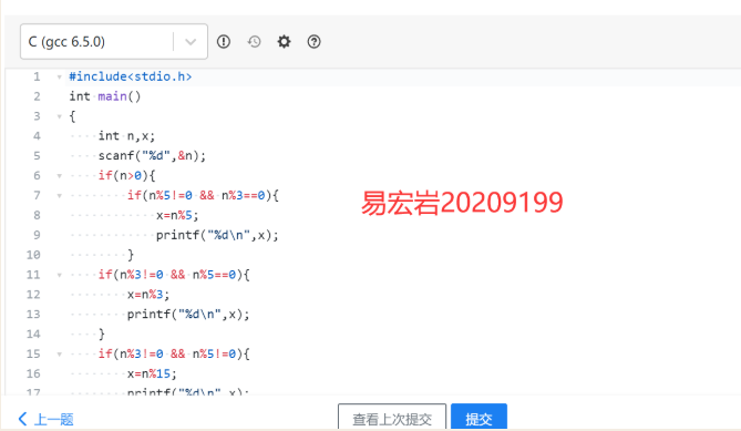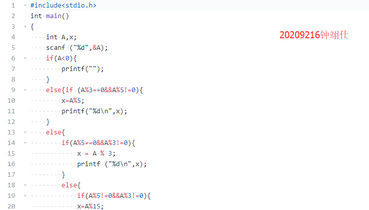 键盘输入1个正的整数A,如果A是3的倍数但不是5的倍数,则输出A除以5的余数。如果A是5的倍数但是不是3的倍数,则输出A除以3的余数。如果A既不是5的倍数但也不是3的倍数,输出A除以15的余数