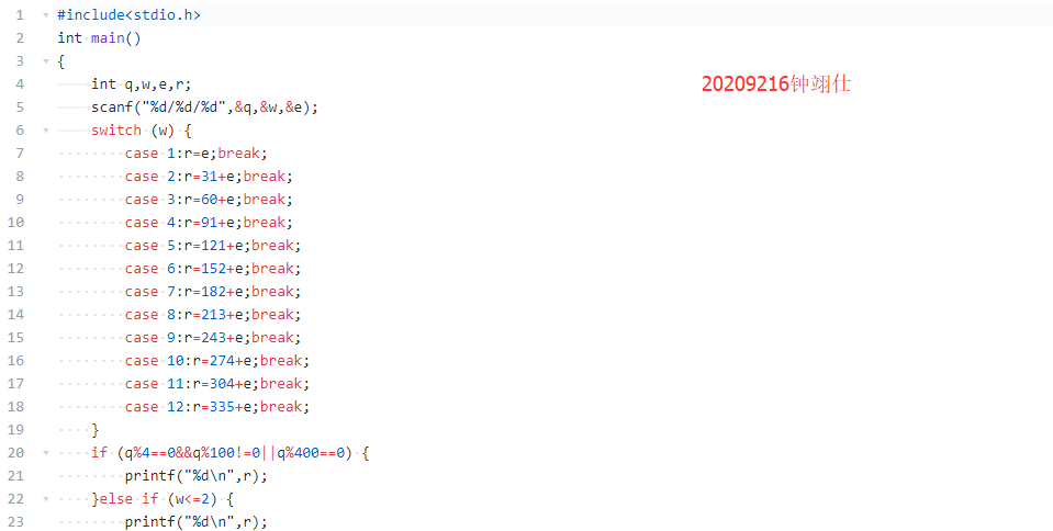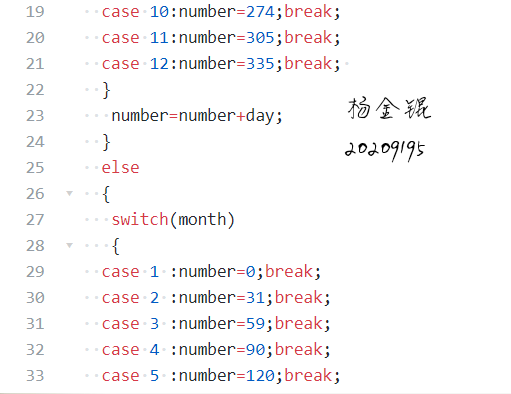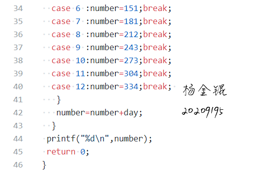3.运用的语句有所不同,杨金锟在处理计算天数这题时,所用的只有switch结构,这使得所需代码长度大大增加,而我将switch和if-else结合能使其变得简便许多。