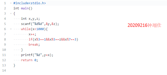 妈妈给小明家新送来 y个鸡蛋。 已知小明家原有鸡蛋的个数x是满足“三个三个的数剩1个,5个5个数剩z个,7个7个数剩3个”的最小数, 请问小明家共有多少个鸡蛋? (设输入为正数,不考虑非法输入)