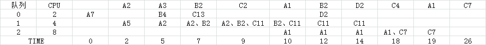 3. 现设定采用三级反馈队列调度算法,三个队列分别为0、1和2,对应时间片为2、4、8。现有四个进程A、B、C、D,到达时刻分别为0、5、7、12,执行时间分别为7、4、13、2。请写出整个进程调度过程,包括每个时间段,执行的进程,执行后进程状态,各个队列内进程的变化。