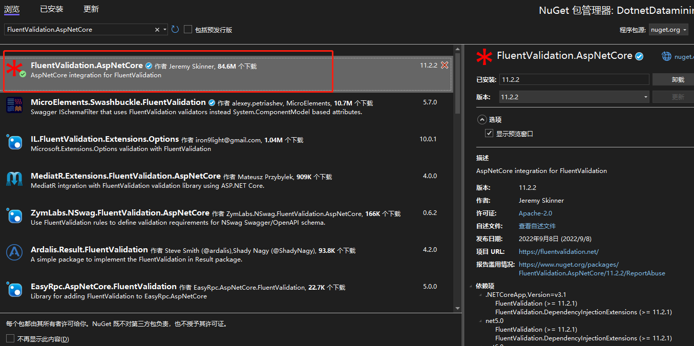 一、首先在nuget管理器中添加FluentValidation.AspNetCore包