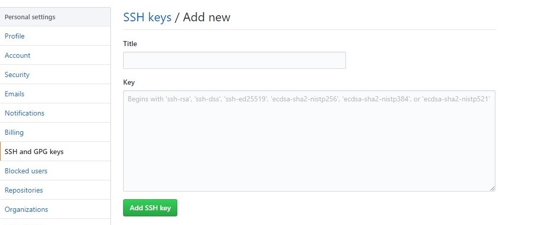 执行完上述命令后在用户主目录里(C:\Users\.)找到.ssh目录,里面会有有id_rsa和id_rsa.pub两个文件,将.pub里的内容粘贴到GitHub上,如下