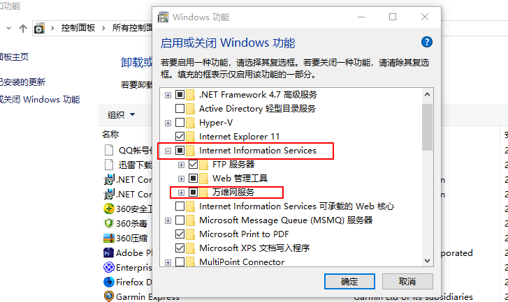 将internet information services下 万维网服务的相关选项勾选并点击确定