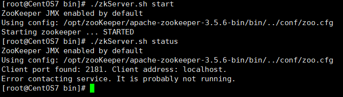 - 当我们安装好zooKeeper,启动后通过 ./zkServer.sh status查看状态时会爆Error contacting service. It is probably not running.错误如下图: