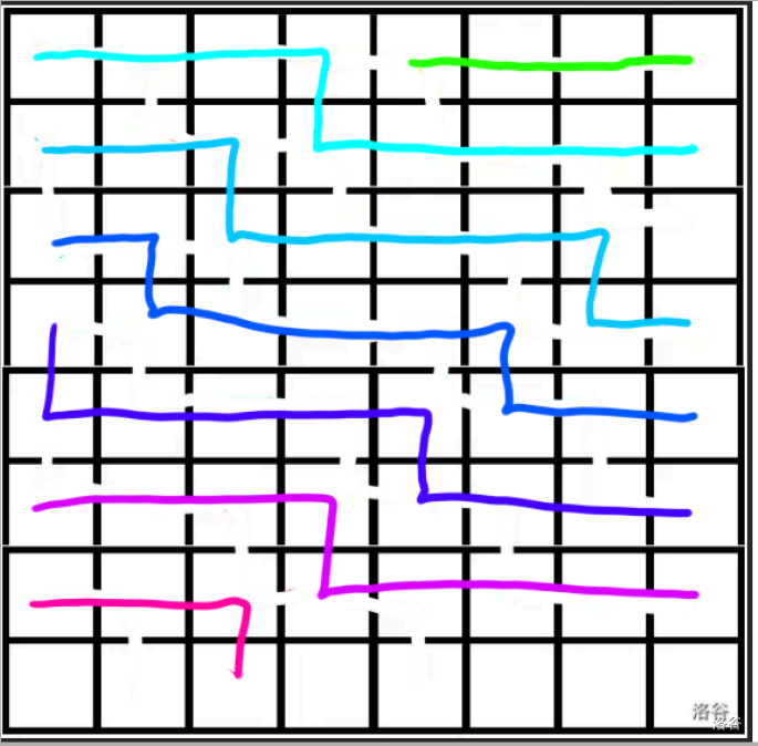 \(1+y\equiv0\pmod k\) 的位置是向下的拐点,所以 \(1+y\equiv1\pmod k\) 也就是 \(y\equiv0\pmod k\) 的位置是一条链的起点,这个同样是 \(\frac{n}{k}\) 量级的,同样可以暴力枚举起点 \((1,y)\),那么拐点就是 \((1,y+k-1)\),而拐点之后的路径也是恒定的,可求得向下走的次数为 \(\lceil\frac{n-(y+k-1)}{k-1}\rceil\),向右走的次数就是 \(n-y\)。 - 第一列到第 \(n\) 列
