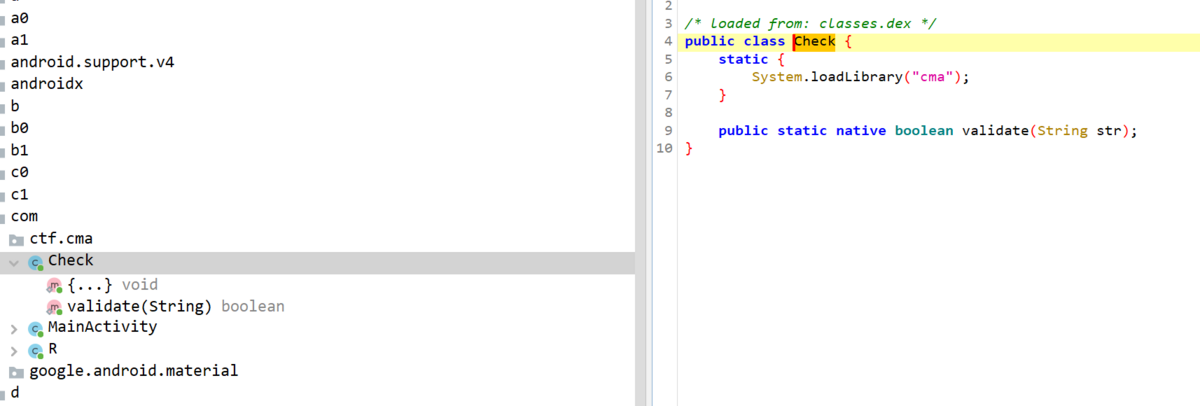 先是jadx反编译打开之后,开始找程序入口点,即MainActivity,然后找onclick事件,然后一直找一直到找到check检查函数,但是里面只有几行,有个cma