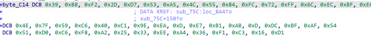 点开byte_C14数组之后有一大串字符串(其实这去掉0x,提取出来就是密文,但当时可能脑袋宕机了,一直觉得还要再处理一下,然后一直找处理函数)