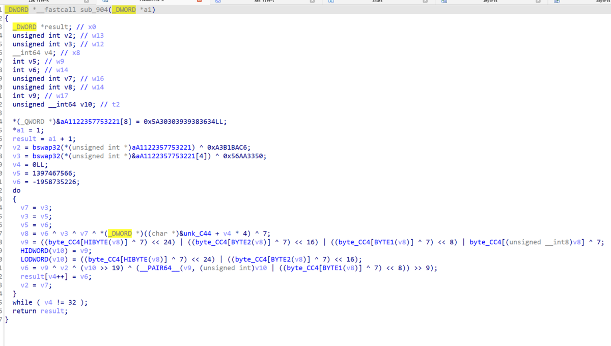 然后点开sub_904函数,其实当时是看不懂的,但是有ai助我,大致分析了一下应该是sm4加密(可能是与bswap32这个函数有关)