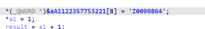 这个的意思就是将原本aA1122357753221数组的后八位改成Z0099864,但是要注意的是这里是小端存储,所以要倒着填充后八位,所以实际密钥就是A11223574689900Z,刚好16位,128bit