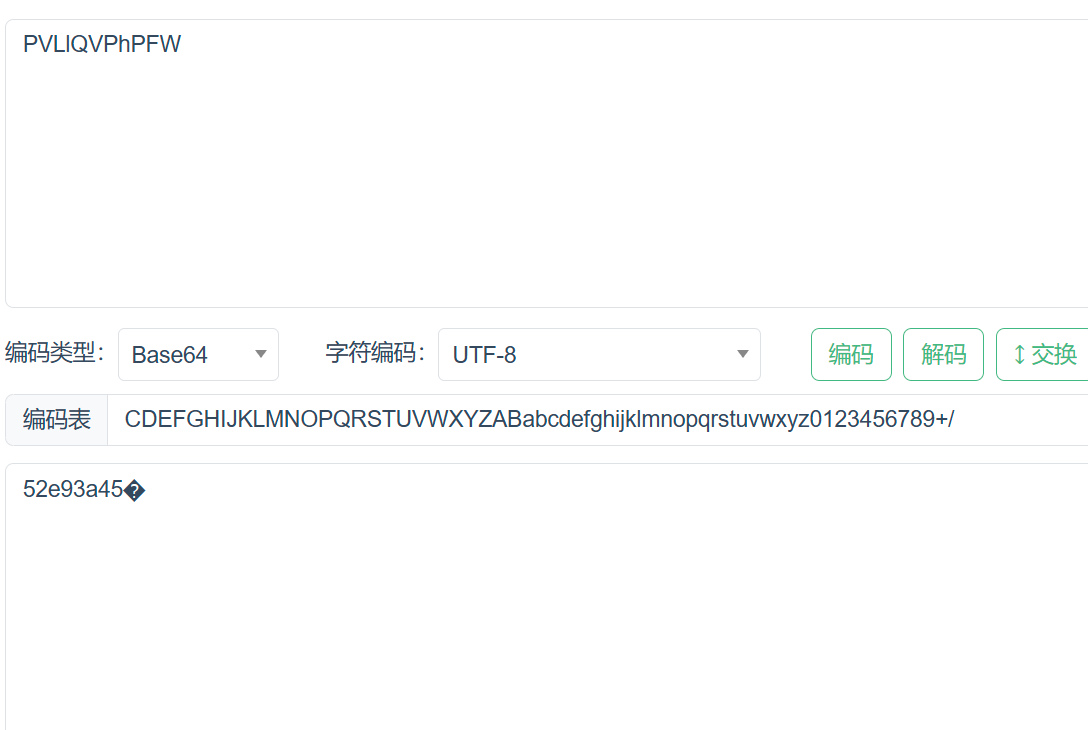这个就是base64换表(前面短一个C,需要补一下),然后在线网站解密即可