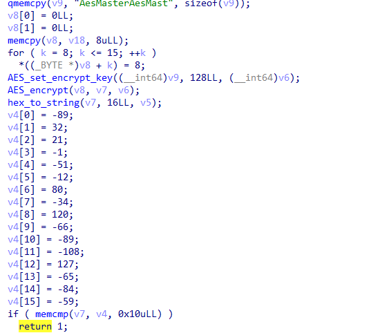 第四段就是AES_set_encrypt_key函数使用AesMasterAesMast生成一个密钥,然后AES_encrypt函数在根据密钥去加密,最后将加密后的内容hex_to_string处理后与v4数组匹配,所以其实v8其实并没有上面用,就是单纯的充当了一个明文的存在,所以写脚本逆向即可