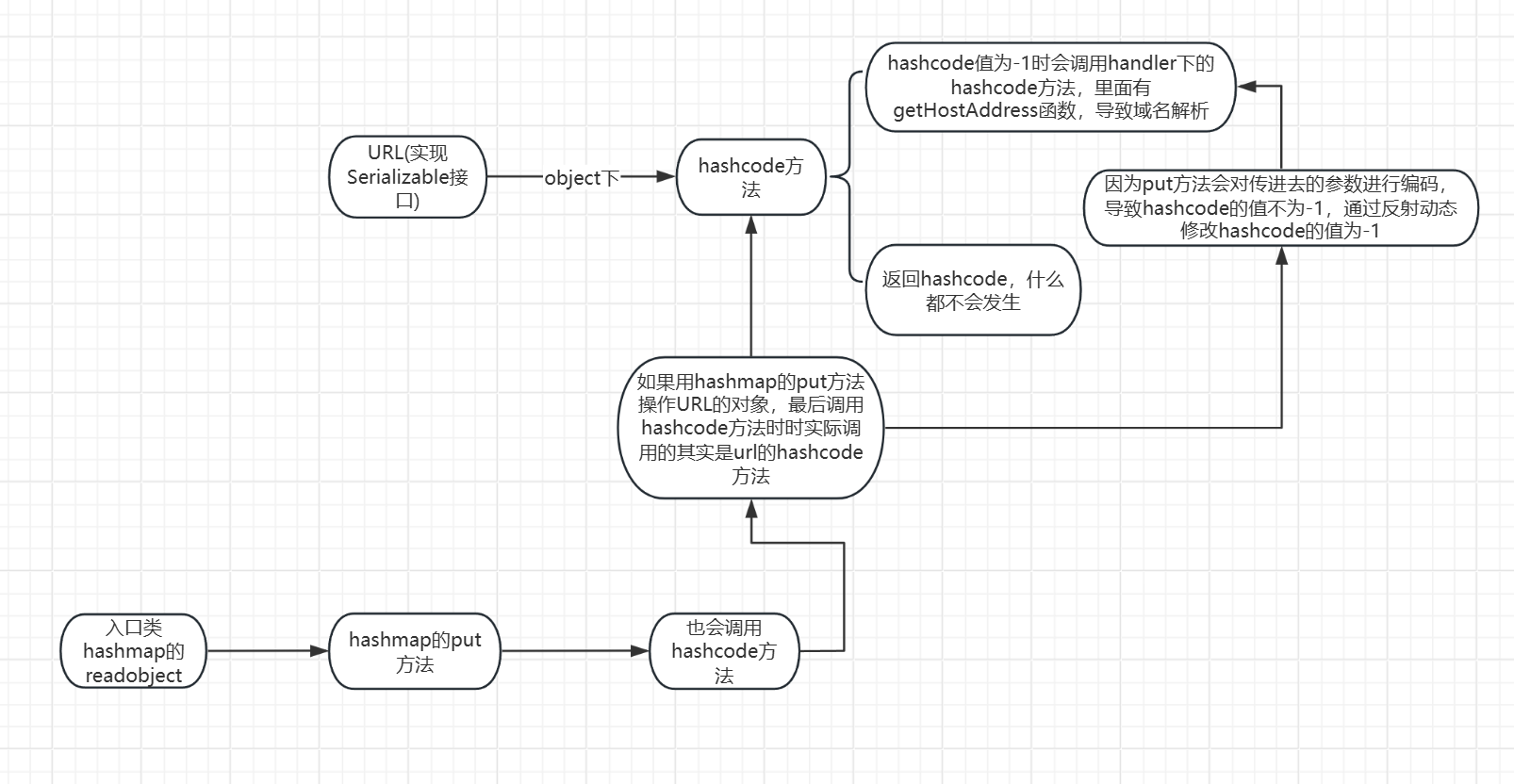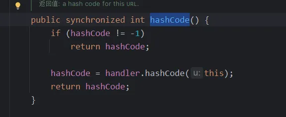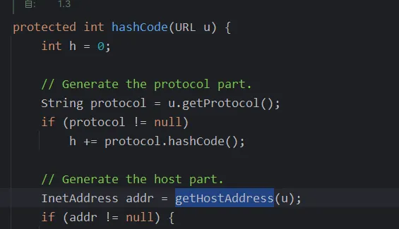 然后看一个常见都存在的函数hashCode,发现URL类种存在该函数,然后点进去handler下的hashcode函数,发现有个getHostAddress函数,存在域名解析的危害即ssrf
