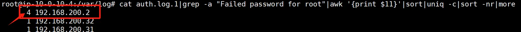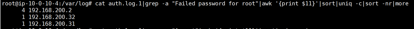 cat auth.log.1 | grep -a "Failed password for root" | awk '{print $11}' | sort | uniq -c | sort -nr | more