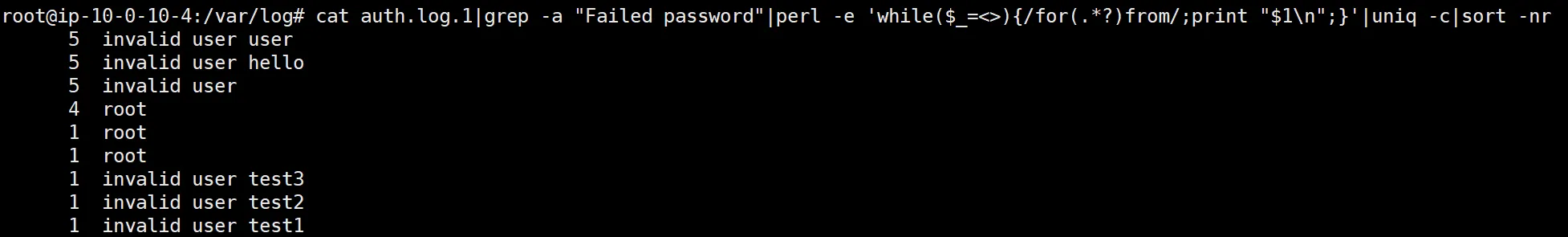 cat auth.log.1 | grep -a "Failed password" |perl -e 'while($_=<>){ /for(.*?) from/; print "$1\n";}'|uniq -c|sort -nr