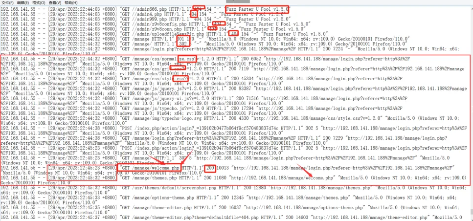 然后打开日志往下面翻,发现了有一堆404的请求,然后最后又有了200的请求,仔细看一看发现了Fuzz Faster U Fool工具的目录爆破,然后又有了css静态文件的查看,最后有了登陆成功welcome的提示,说明登录成功