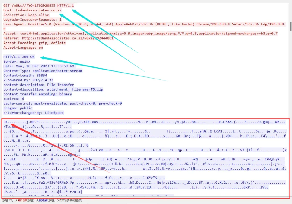 第三关:下载数据包文件 hacker1.pacapng,分析 zip 压缩包通过加载其中的 javascript 文件到另一个域名下载后续恶意程序, 该域名是什么?提交答案:flag{域名}(无需 http、https);
