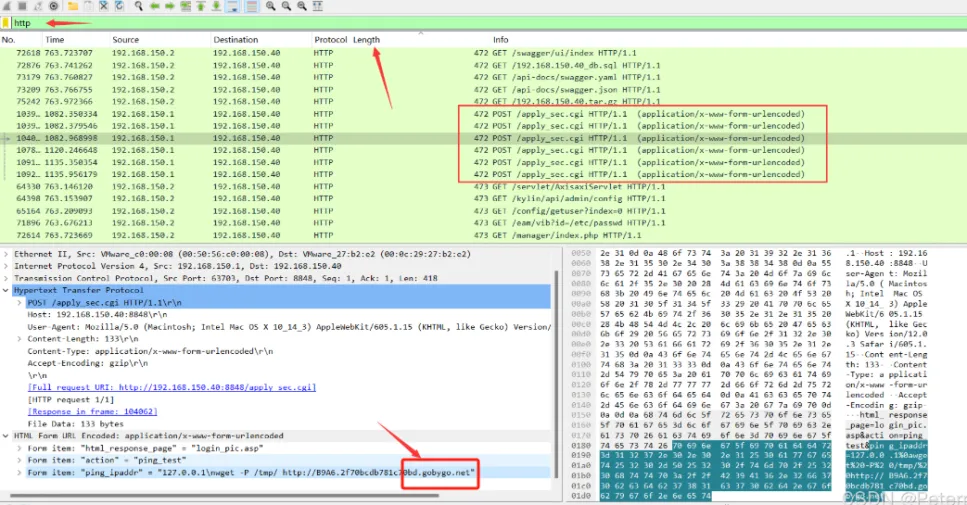 然后在post请求访问apply_sec.cgi文件的流量包下发现了goby的扫描痕迹