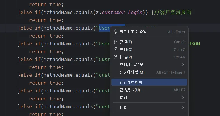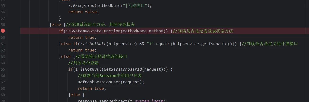 然后跟进去能在59行看到一个哪些是不用登陆就能访问方法(也就是所谓的前台漏洞)