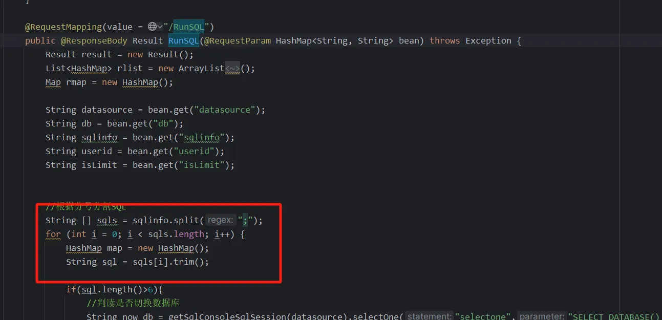RunSQL路由中跟进来就可以发现一个根据;分割sql语句的方法