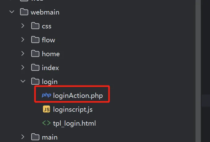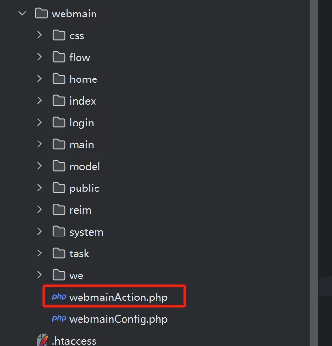 又因为ROOT_PATH是/,p是webmain,所以替换完之后就是/webmain/webmainAction.php,然后我们看一下目录发现的确有该文件