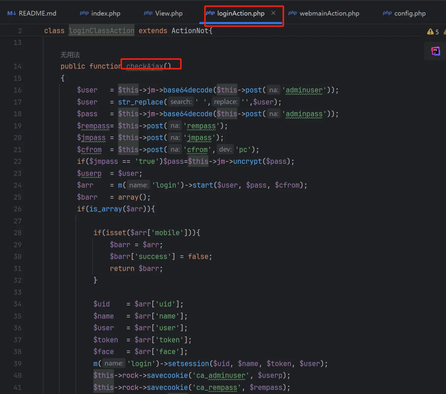 然后这里的a是代表在loginAction中的方法,这时候ajaxbool是true,所以调用的是loginAction.php中的checkAjax方法