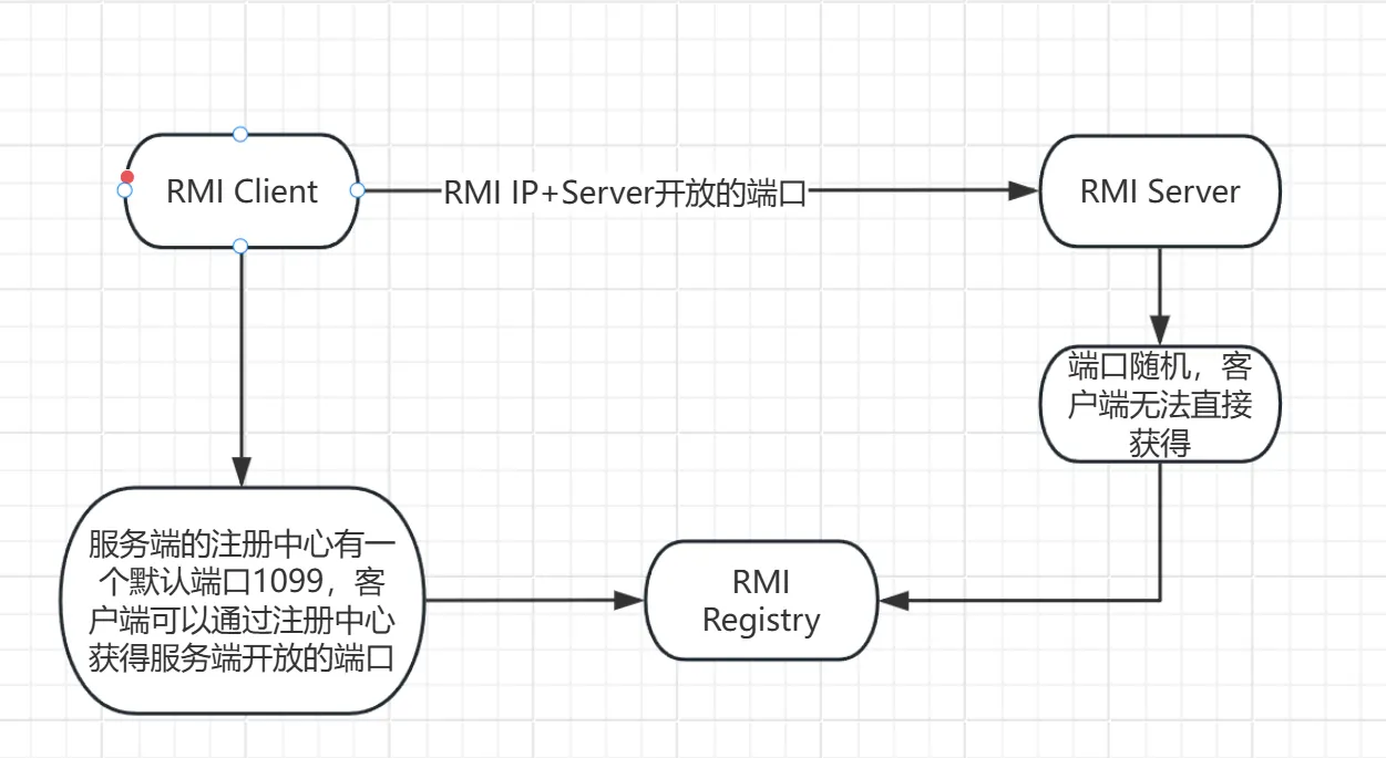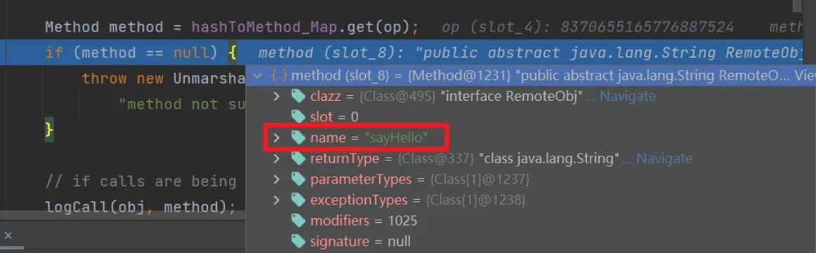 - 客户端首先去连接服务端的注册中心RMI Registry,然后在其中寻找name是某个方法(下文中示例是Hello)的对象,这个过程对应数据流中的Call信息