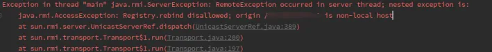报错原因是Java对远程访问RMI Registry做了限制,只有来源地址是localhost的时候,才能调用rebind、 bind、unbind等方法。
