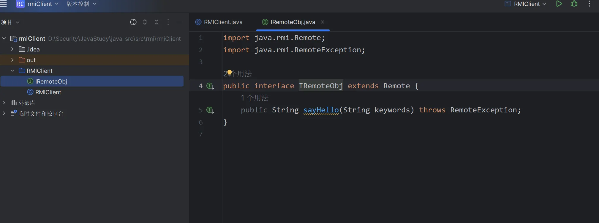 客户端第三句代码remoteObj.sayHello("hello");