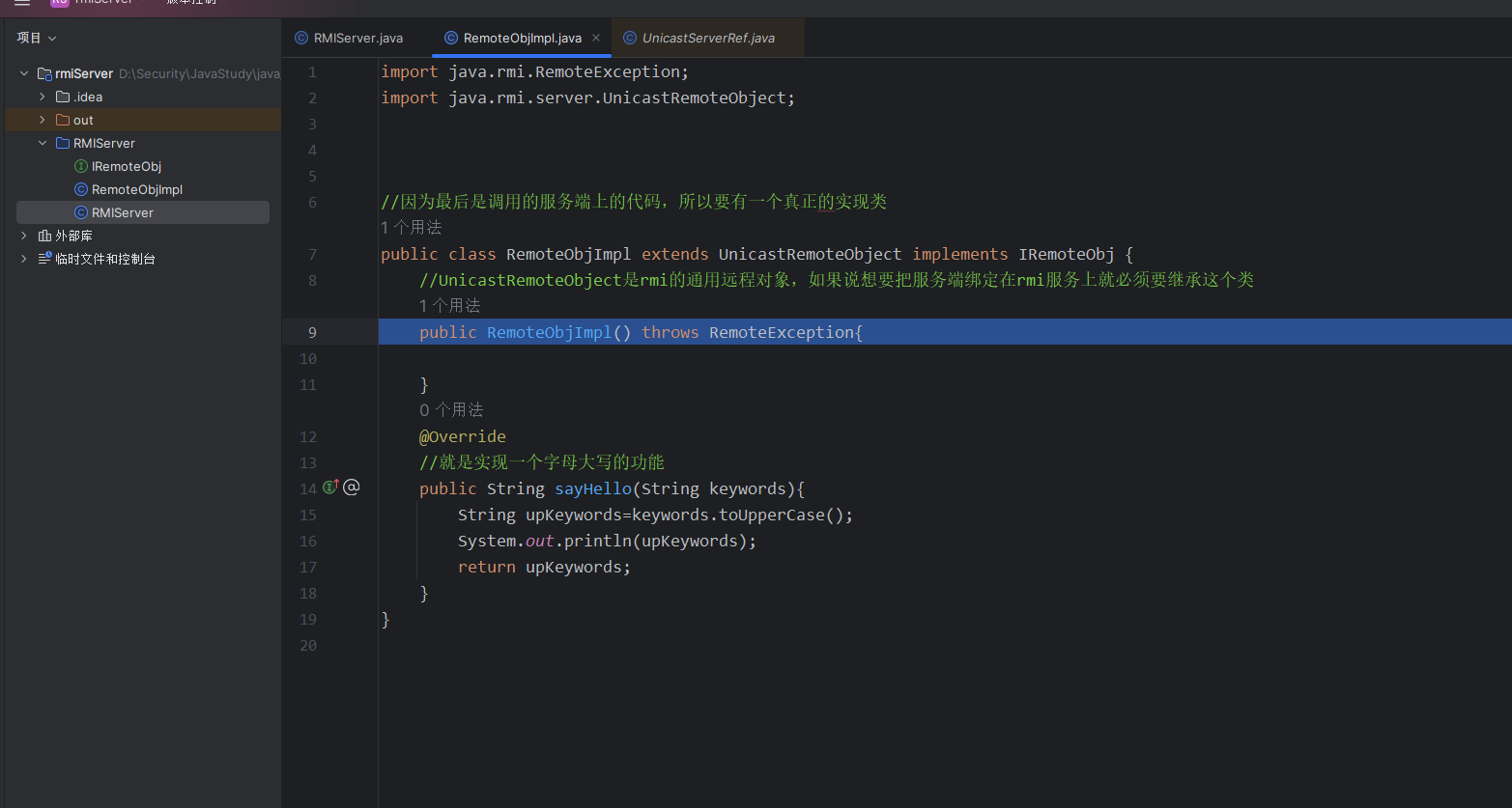 //UnicastRemoteObject是rmi的通用远程对象,如果说想要把服务端绑定在rmi服务上就必须要继承这个类